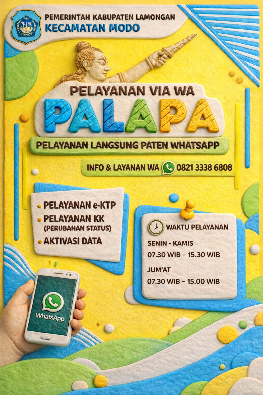 Aplikasi pelayanan via Whatsapp SEGO BORAN (Sarana Elektronik Gratis Berkas Online Administrasi Kependudukan) oleh Dinas Kependudukan dan Pencatatan Sipil Kabupaten Lamongan.