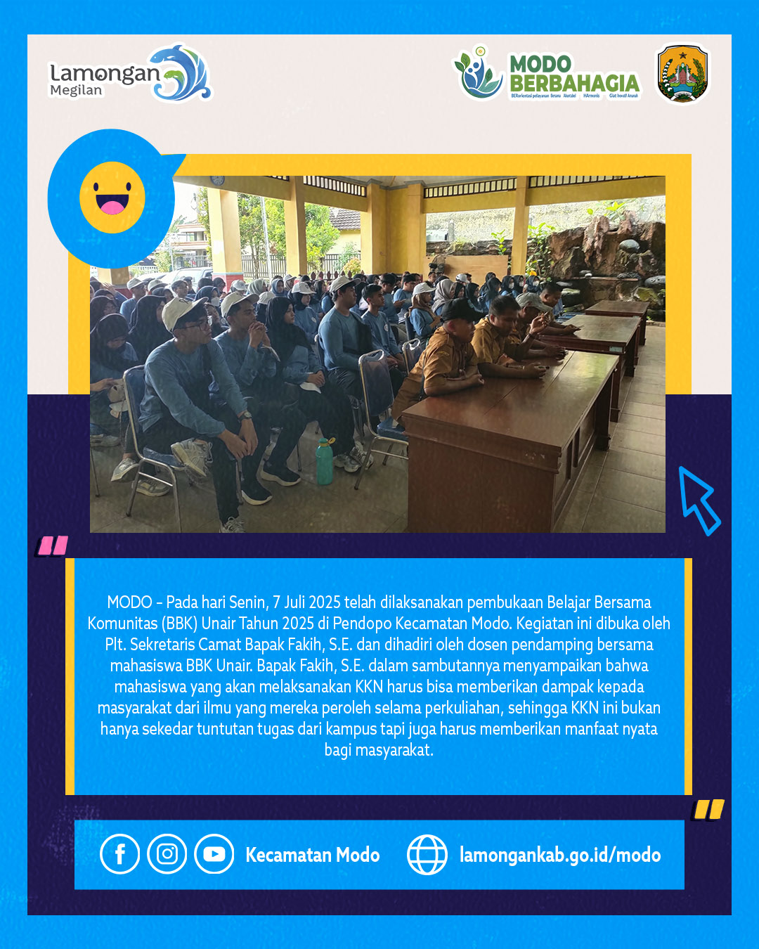 MODO – Pada hari Senin, 7 Juli 2025 telah dilaksanakan pembukaan Belajar Bersama Komunitas (BBK) Unair Tahun 2025 di Pendopo Kecamatan Modo. Kegiatan ini dibuka oleh Plt. Sekretaris Camat Bapak Fakih, S.E. dan dihadiri oleh dosen pendamping bersama mahasiswa BBK Unair. Bapak Fakih, S.E. dalam sambutannya menyampaikan bahwa mahasiswa yang akan melaksanakan KKN harus bisa memberikan dampak kepada masyarakat dari ilmu yang mereka peroleh selama perkuliahan, sehingga KKN ini bukan hanya sekedar tuntutan tugas dari kampus tapi juga harus memberikan manfaat nyata bagi masyarakat.