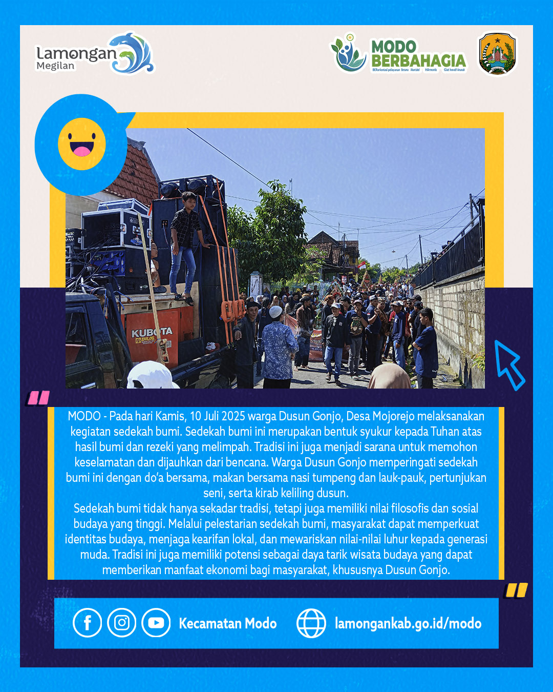 MODO - Pada hari Kamis, 10 Juli 2025 warga Dusun Gonjo, Desa Mojorejo melaksanakan kegiatan sedekah bumi. Sedekah bumi ini merupakan bentuk syukur kepada Tuhan atas hasil bumi dan rezeki yang melimpah. Tradisi ini juga menjadi sarana untuk memohon keselamatan dan dijauhkan dari bencana. Warga Dusun Gonjo memperingati sedekah bumi ini dengan do’a bersama, makan bersama nasi tumpeng dan lauk-pauk, pertunjukan seni, serta kirab keliling dusun.