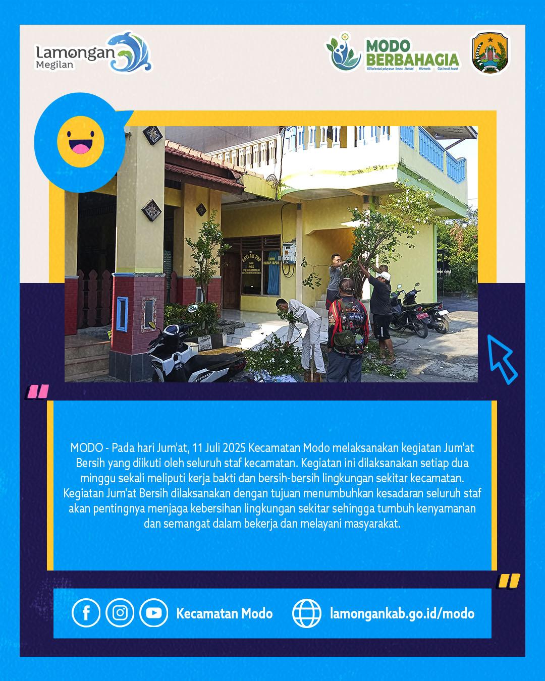 MODO - Pada hari Jum'at, 11 Juli 2025 Kecamatan Modo melaksanakan kegiatan Jum'at Bersih yang diikuti oleh seluruh staf kecamatan. Kegiatan ini dilaksanakan setiap dua minggu sekali meliputi kerja bakti dan bersih-bersih lingkungan sekitar kecamatan. Kegiatan Jum'at Bersih dilaksanakan dengan tujuan menumbuhkan kesadaran seluruh staf akan pentingnya menjaga kebersihan lingkungan sekitar sehingga tumbuh kenyamanan dan semangat dalam bekerja dan melayani masyarakat.