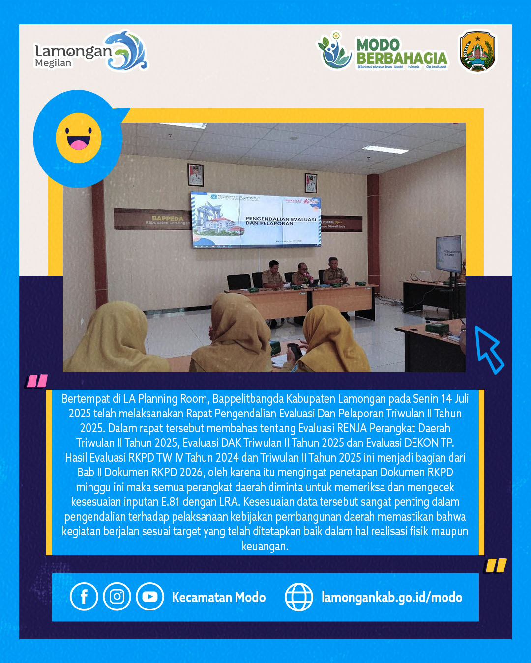 Bertempat di LA Planning Room Bappelitbangda Kabupaten Lamongan pada Senin 14 Juli 2025 telah melaksanakan Rapat Pengendalian Evaluasi Dan Pelaporan Triwulan II Tahun 2025. Dalam rapat tersebut membahas tentang Evaluasi RENJA Perangkat Daerah Triwulan II Tahun 2025, Evaluasi DAK Triwulan II Tahun 2025 dan Evaluasi DEKON TP.