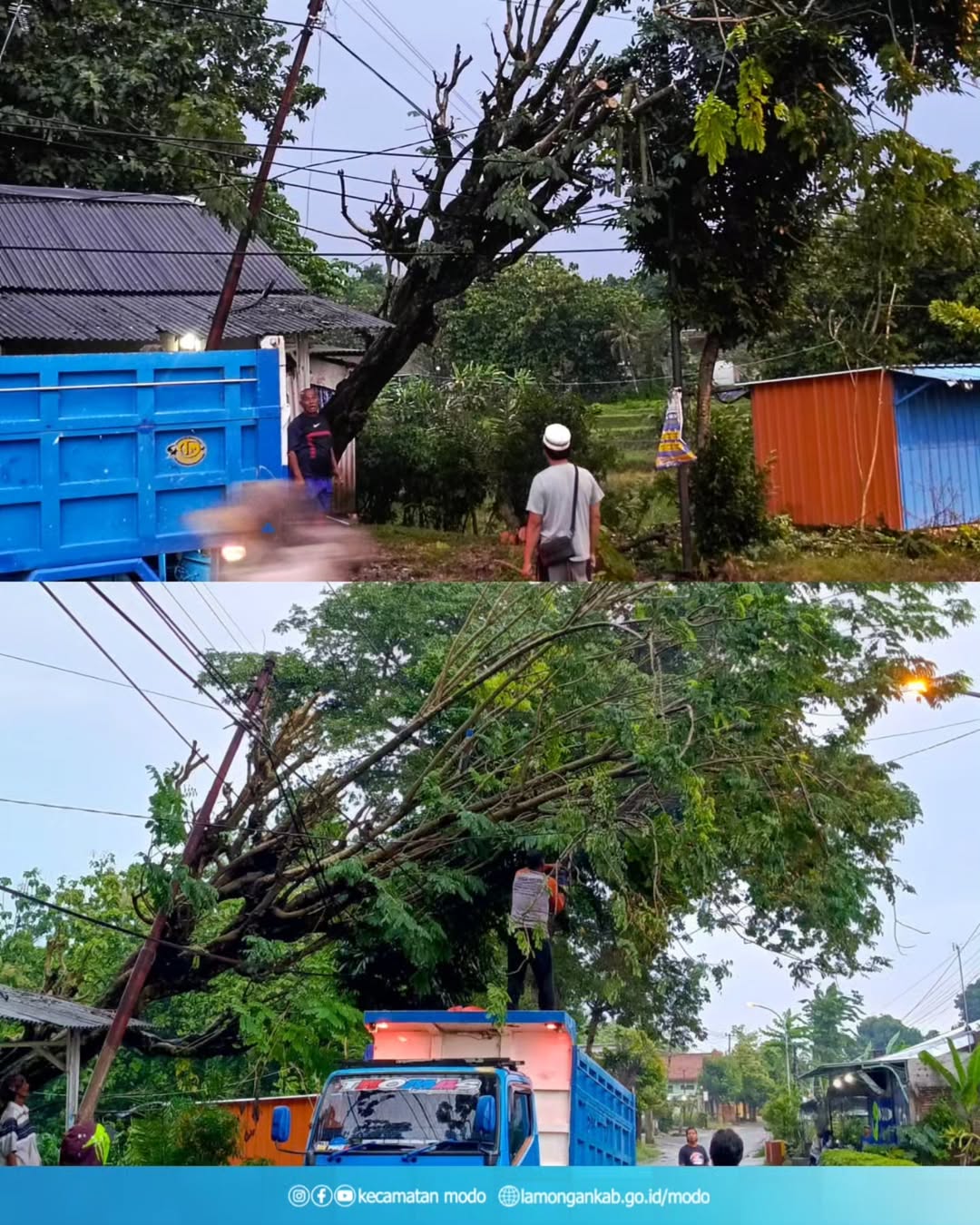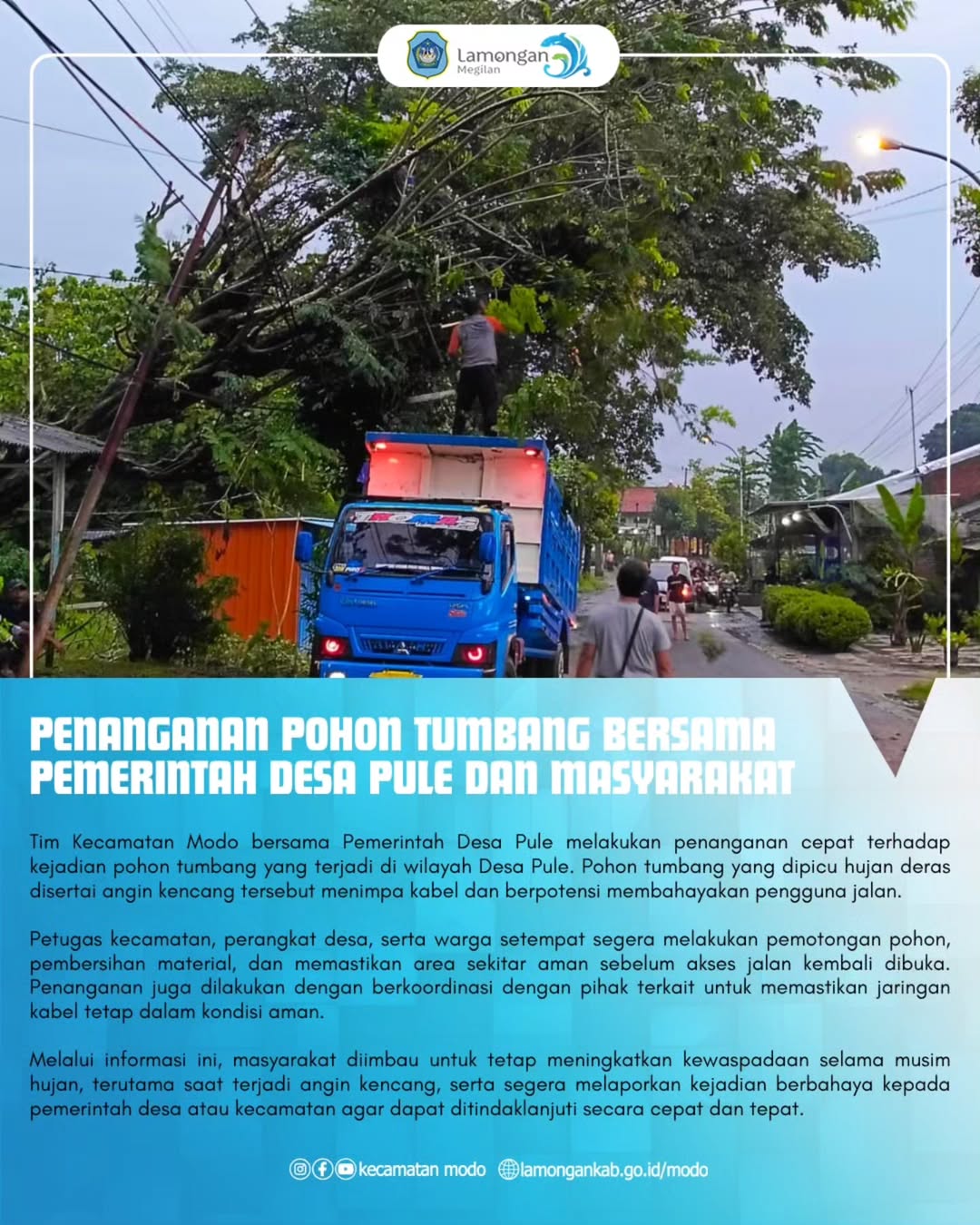 MODO, 20 November 2025 - Tim Kecamatan Modo bersama Pemerintah Desa Pule melakukan penanganan cepat terhadap kejadian pohon tumbang yang terjadi di wilayah Desa Pule. Pohon tumbang yang dipicu hujan deras disertai angin kencang tersebut menimpa kabel dan berpotensi membahayakan pengguna jalan.