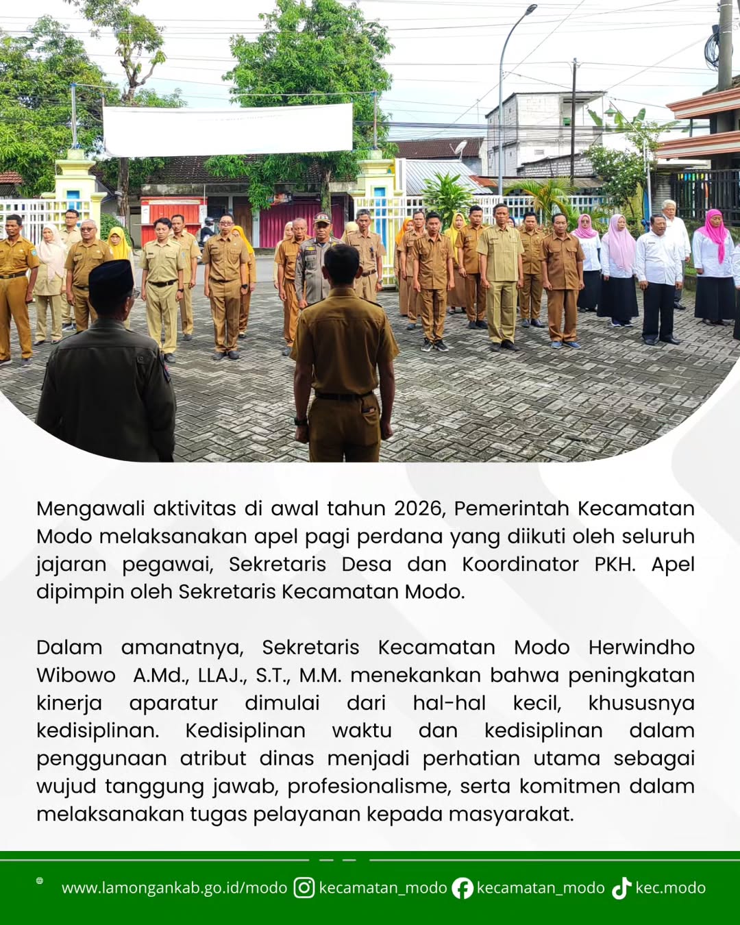 Dalam amanatnya, Sekretaris Kecamatan Modo Herwindho Wibowo A.Md., LLAJ., S.T., M.M. menekankan bahwa peningkatan kinerja aparatur dimulai dari hal-hal kecil, khususnya kedisiplinan. Kedisiplinan waktu dan kedisiplinan dalam penggunaan atribut dinas menjadi perhatian utama sebagai wujud tanggung jawab, profesionalisme, serta komitmen dalam melaksanakan tugas pelayanan kepada masyarakat.