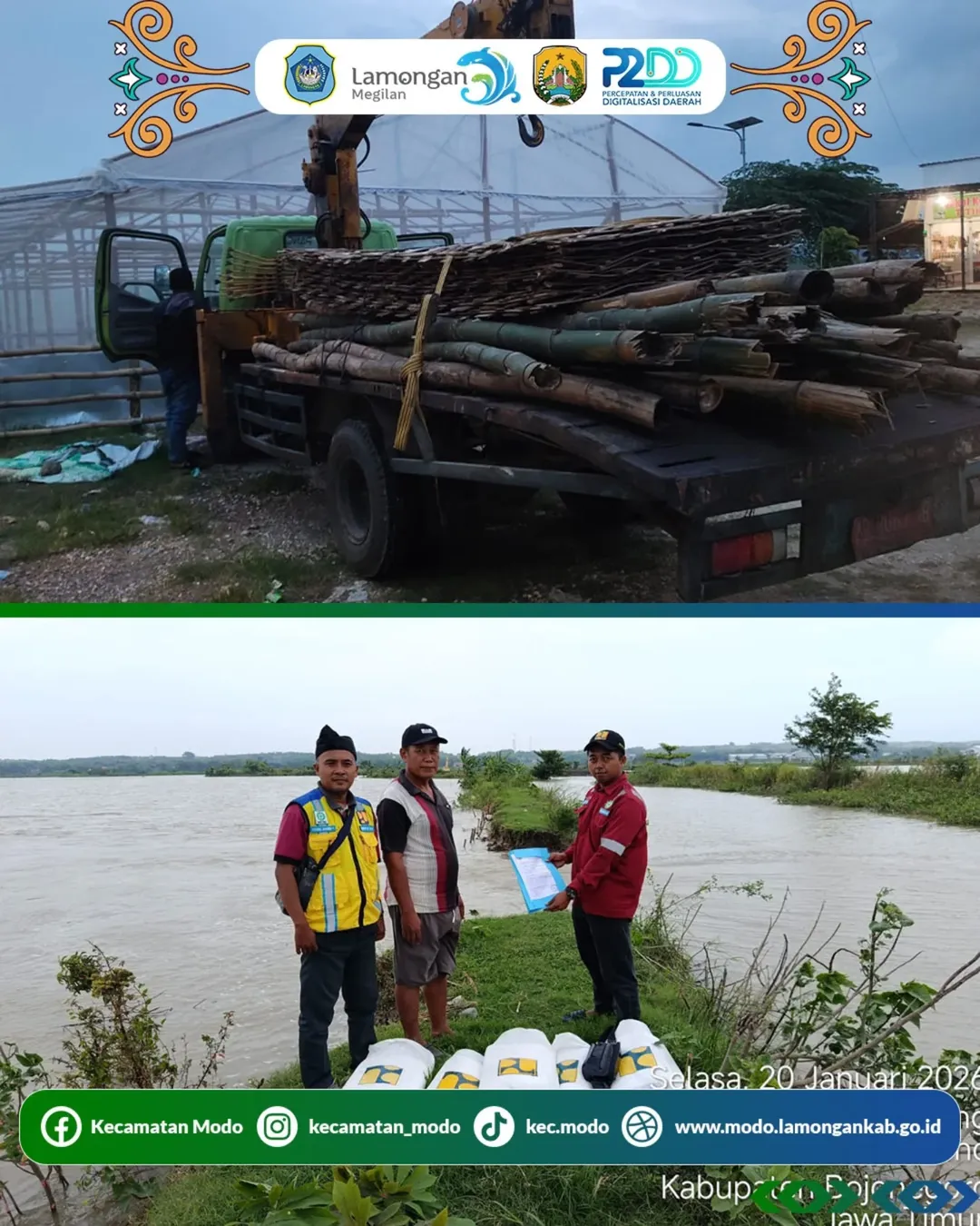 Sebagai upaya penanganan darurat bencana banjir akibat tanggul jebol, Balai Besar Wilayah Sungai Bengawan Solo (BBWS BS) menyalurkan bantuan material kepada Pemerintah Desa Kedungrejo, Kecamatan Modo, Kabupaten Lamongan. Kegiatan pengiriman dan penyerahan bantuan tersebut dilaksanakan pada hari Selasa, 20 Januari 2026.