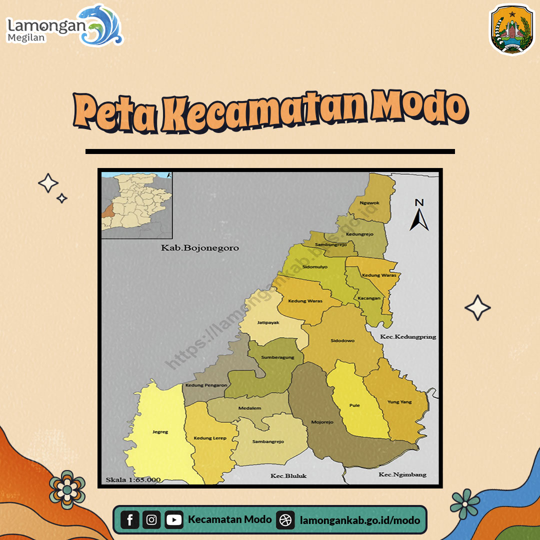 Kecamatan Modo terdiri dari 17 desa, yaitu: Desa jegreg, Desa Kedunglerep, Desa Sambangrejo, Desa Medalem, Desa Kedungpengaron, Desa Sumberagung, Desa Mojorejo, Desa Pule, Desa Yungyang, Desa Sidodowo, Desa Jatipayak, Desa Kedungwaras, Desa Sidomulyo, Desa Kacangan, Desa Sambungrejo, Desa Kedungrejo, dan Desa Nguwok.